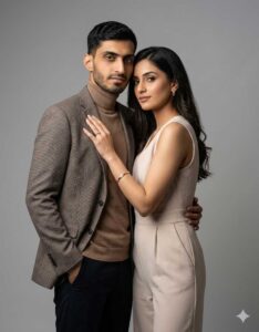 A high-fashion studio photoshoot featuring a couple, perfectly lit with softbox and key lighting for flattering shadows, against a clean, neutral background. The subjects are styled elegantly in modern chic outfits, posed naturally with expressive and intimate body language. Camera: full-frame DSLR, lens: 85mm f/1.4 for sharp focus and smooth bokeh. Post-processing emphasizes natural skin tones, crisp details, and subtle cinematic color grading. Mood: sophisticated, warm, and intimate. Include light reflections and soft shadowing to create depth and realism.